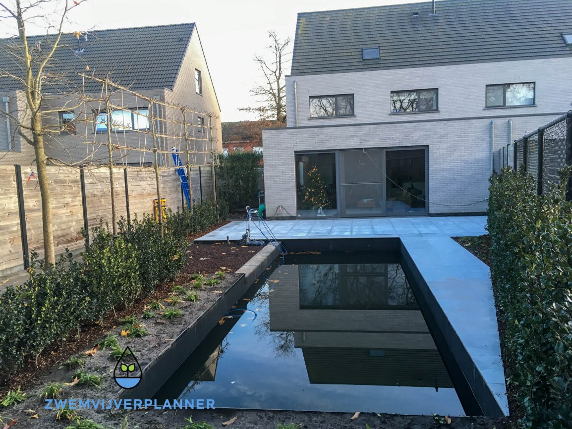 Deze zwemvijver werd volledig geïntegreerd in het terras. Als randafwerking werd er een aluminium lat tegen de muur bevestigd. Hierdoor konden de tegels van het terras tot tegen het zwemgedeelte worden geplaatst. Zo creëert men een waterbeeld dat quasi op hetzelfde niveau ligt als de omliggende tuin.